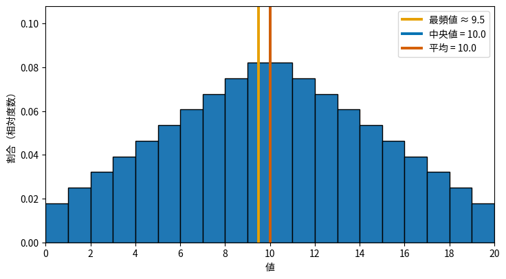 - 左右対称な分布:平均・中央値・最頻値がほぼ同じ位置