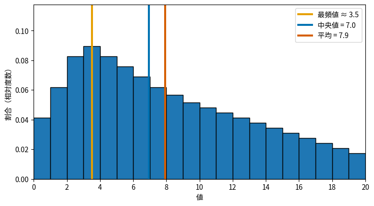 - 右に歪んだ分布:最頻値(山の頂点)< 中央値 < 平均 (少数の高い値が平均を引き上げている)