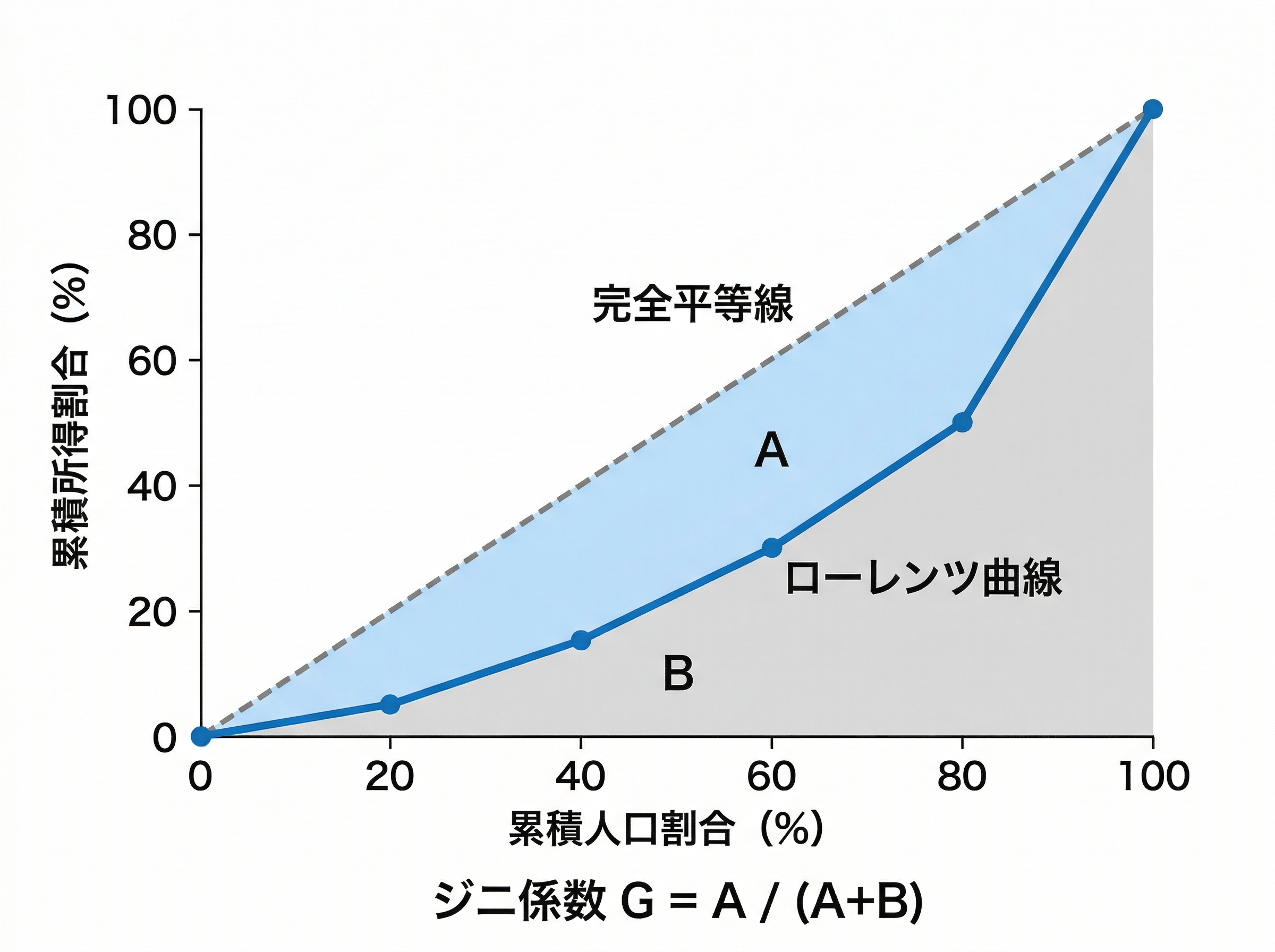 ジニ係数はローレンツ曲線と完全平等線に囲まれた面積から算出される、0から1の値です。0が完全平等、1が完全不平等を意味します。