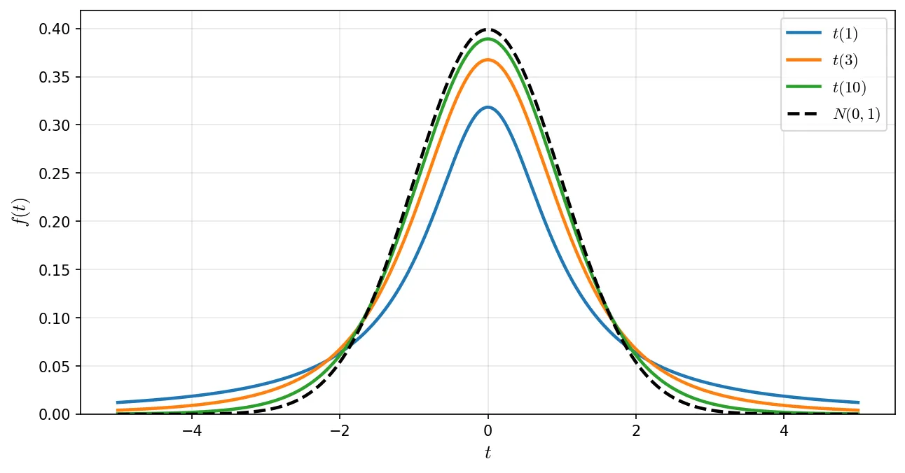 正規分布より裾が厚い形を持ち、母分散の推定に伴う不確実性を反映しています。自由度が大きくなると正規分布に近づきます。