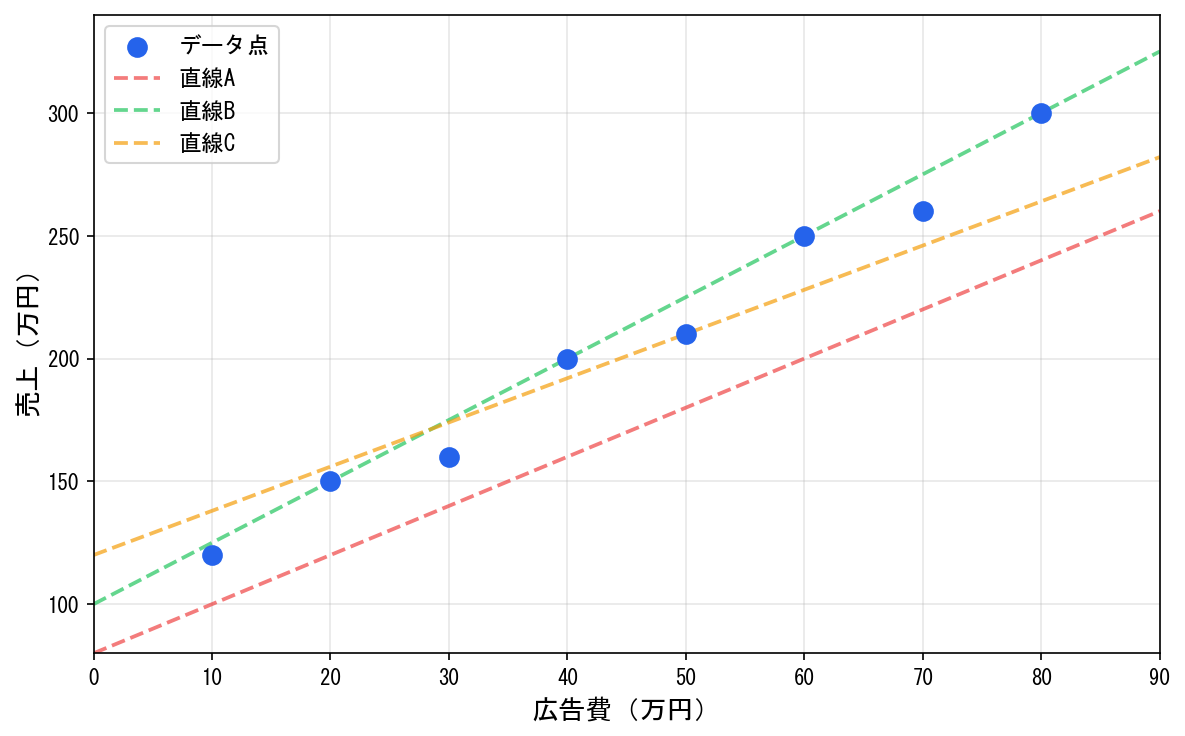 散布図を描くと、広告費が増えるほど売上も増える傾向が見えます。直線を引きたくなりますが、どの直線が「最良」でしょうか?
