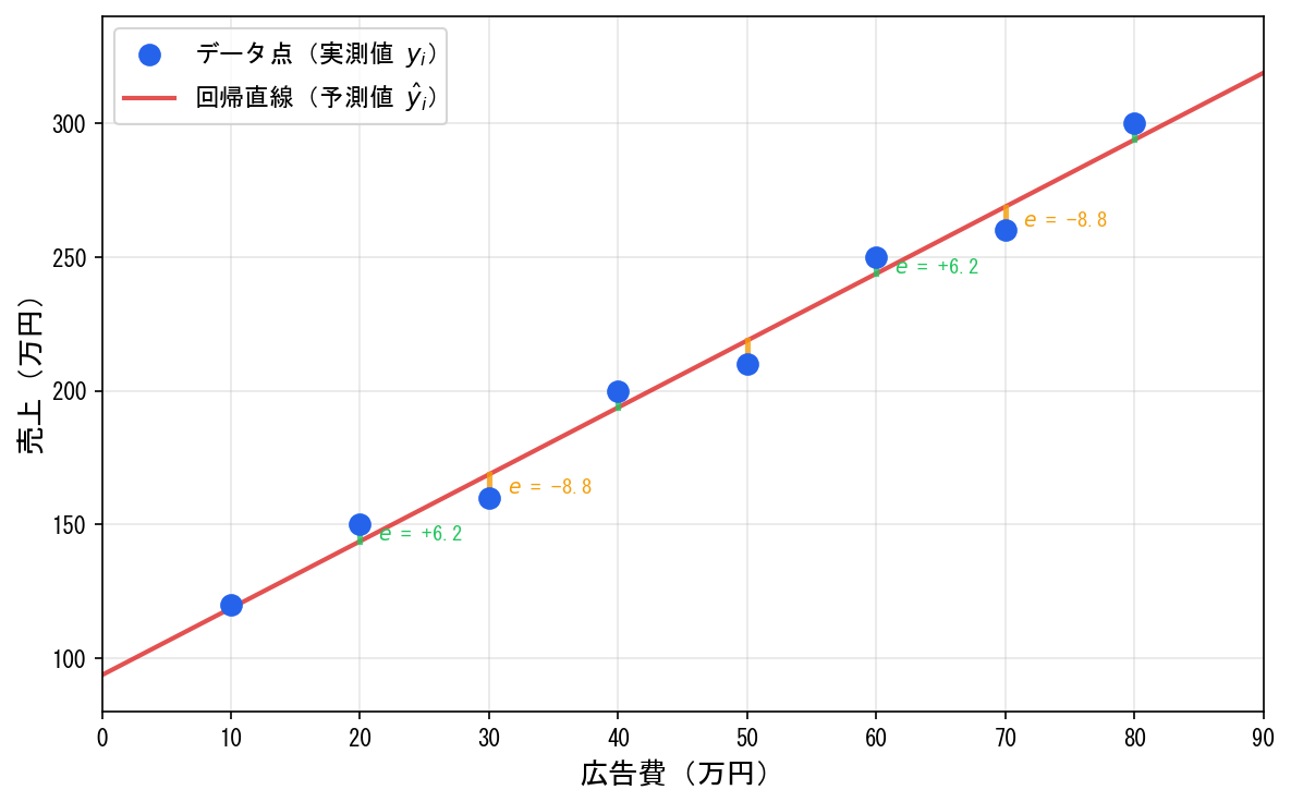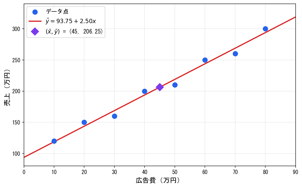 - 切片 a=93.75:広告費が0万円のときの売上の予測値だが、データの範囲外(外挿)のため実務的な意味は薄い